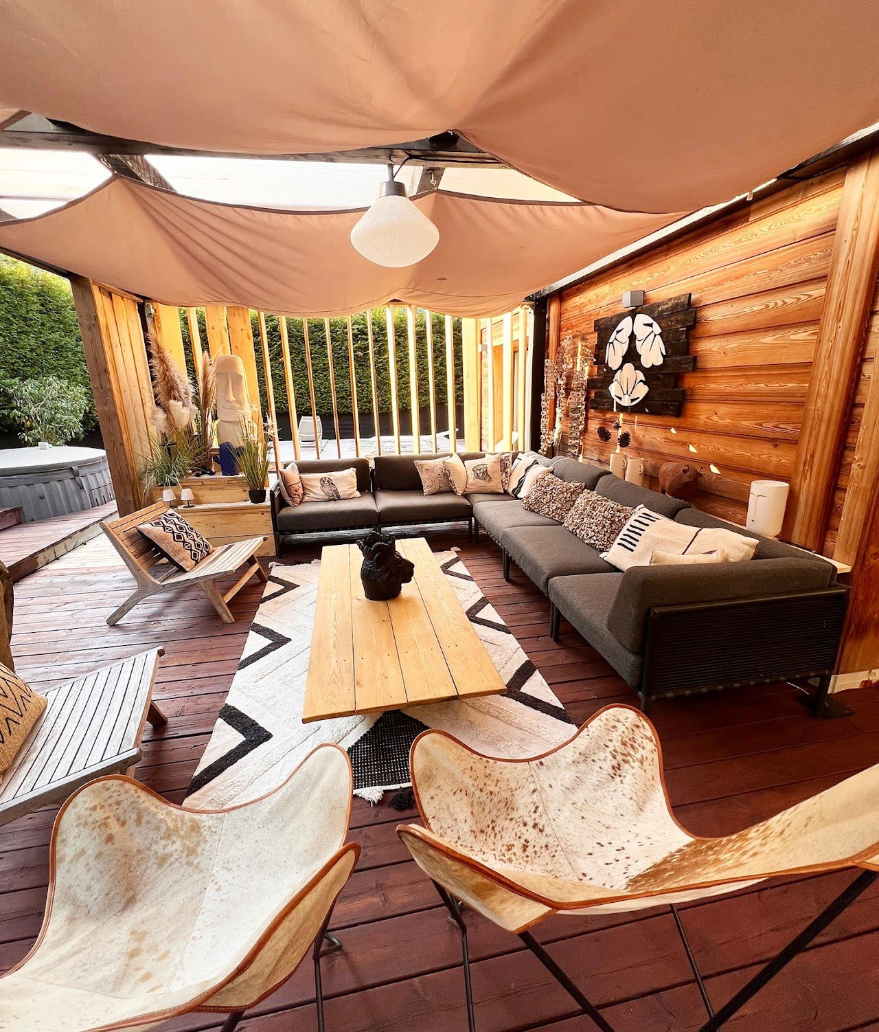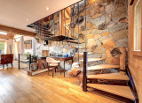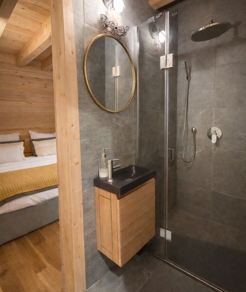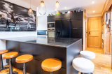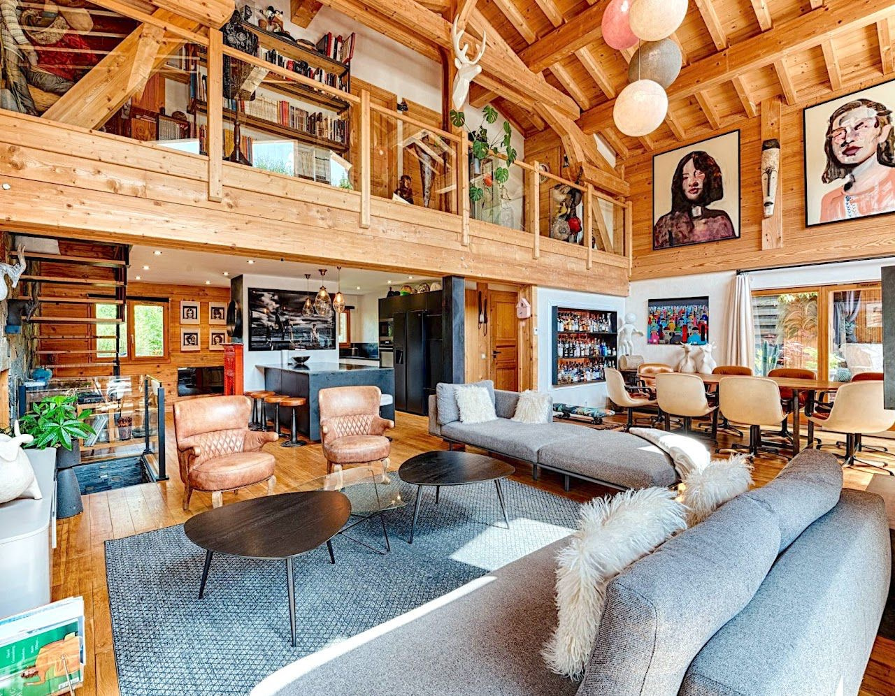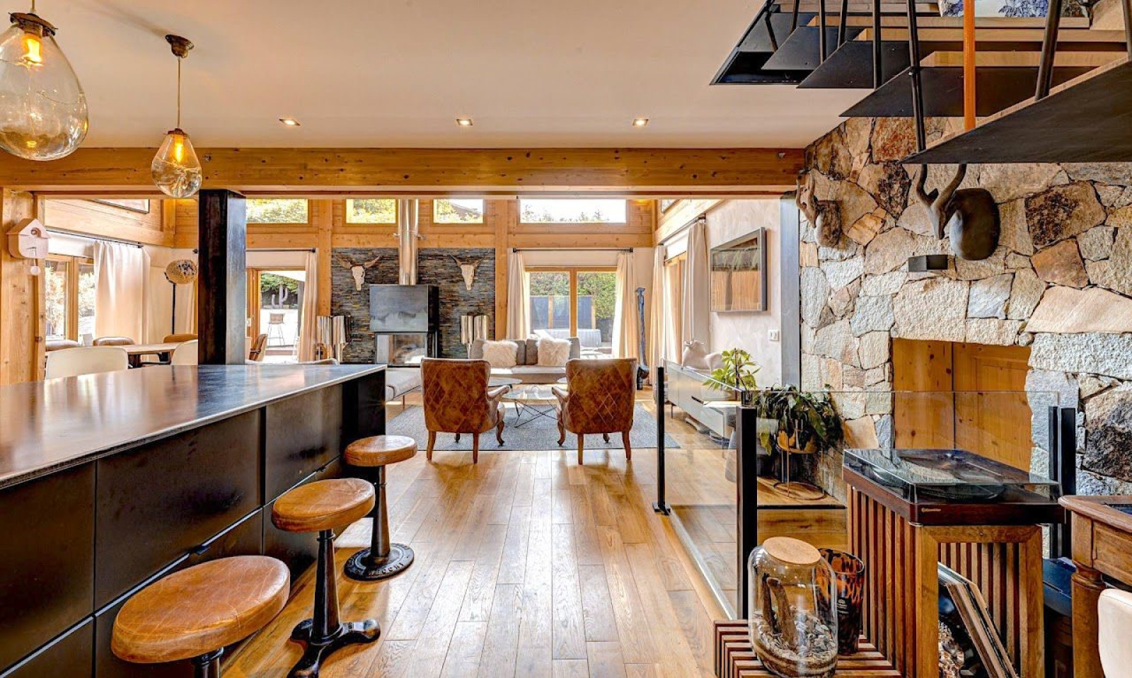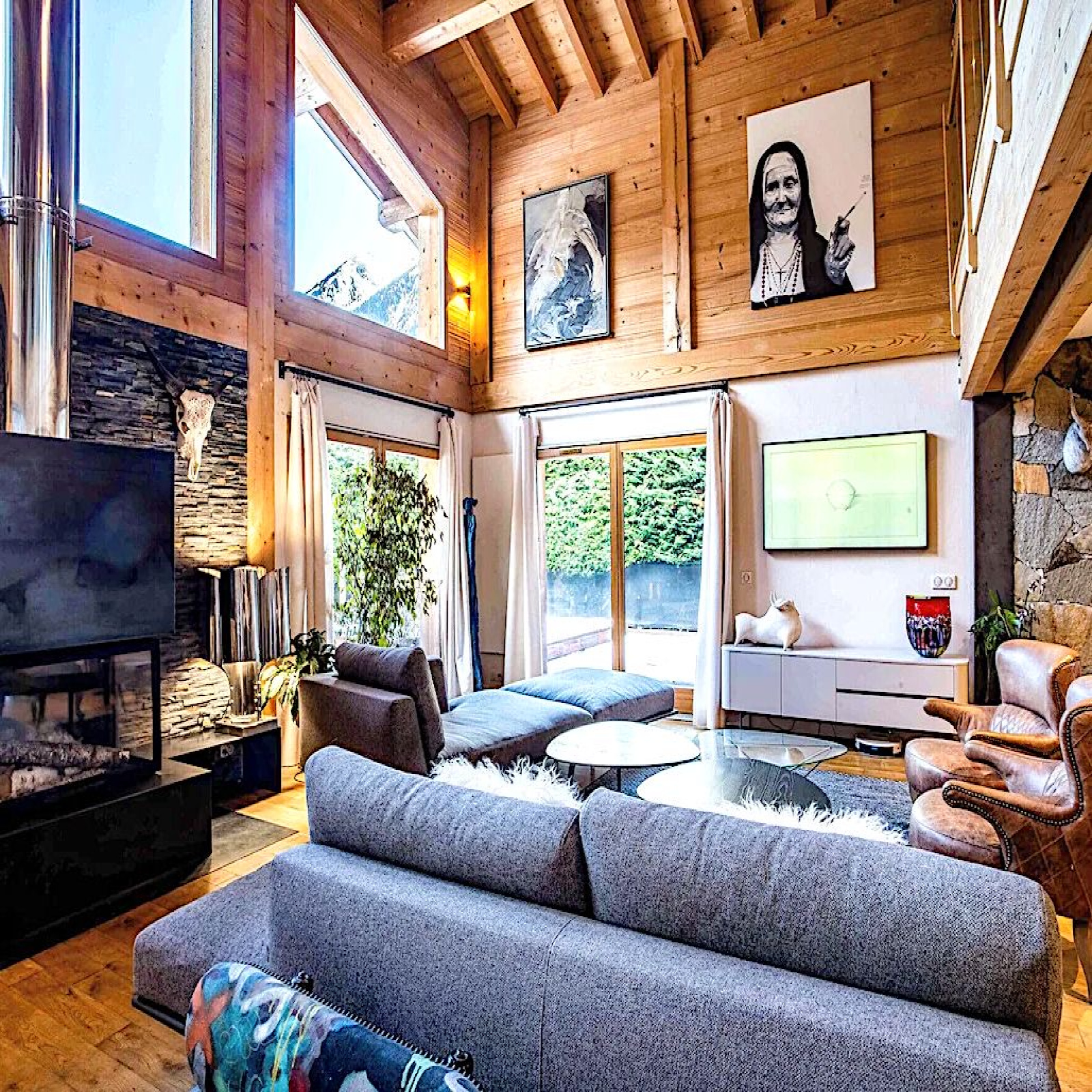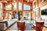 Le séjour, majestueux et baigné de lumière naturelle, s’impose comme le cœur du chalet. Il invite à la détente dans une atmosphère chaleureuse et sophistiquée, sublimée par une ouverture fluide sur les paysages alpins environnants.